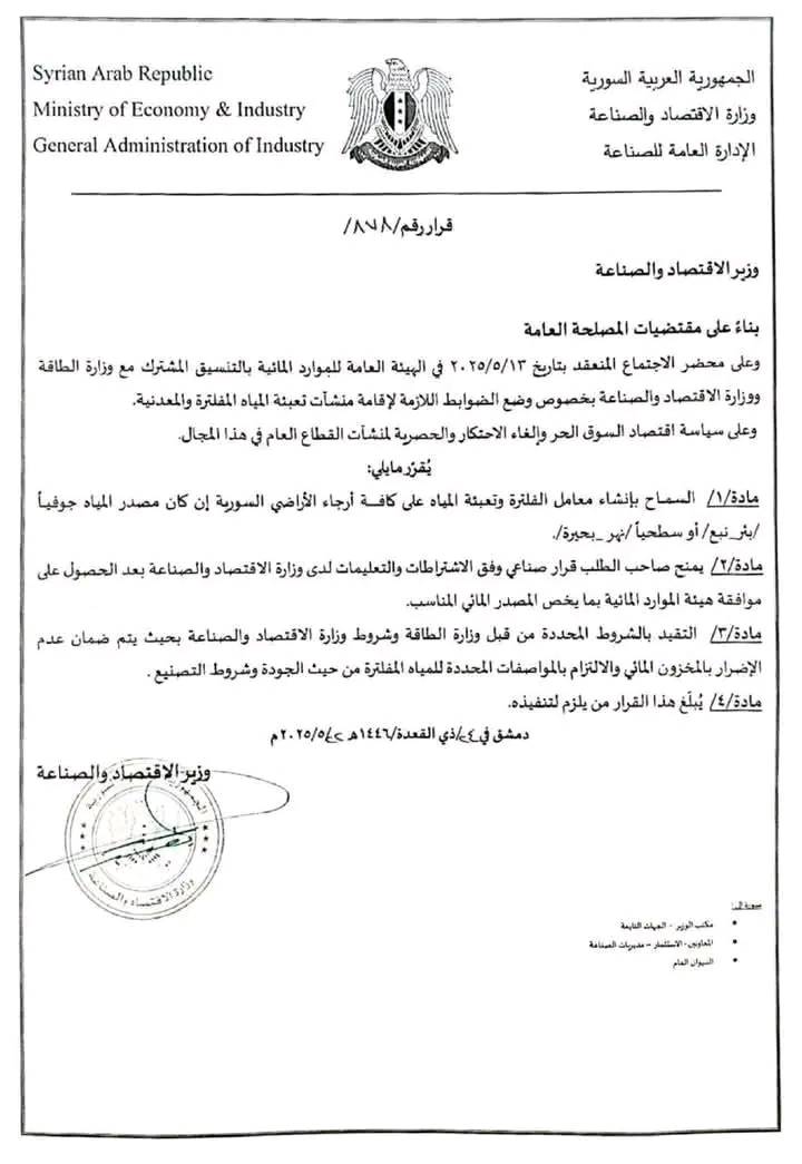 أصدرت وزارة الاقتصاد والصناعة في سوريا قراراً يسمح بإنشاء معامل فلترة وتعبئة المياه في جميع أنحاء البلاد بعد أن كانت غير مسموحة في زمن النظام